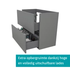 De onderkast is uitgerust met 2 lades, waarin u plaats heeft voor al uw badkamerspullen. Door het systeem met softopen en -close openen en sluiten de lades geluidloos. Bovendien zijn ze extra hoog en volledig uitschuifbaar. Verder heeft het meubel een slimme sifonuitsparing. Hierdoor benut u de beschikbare ruimte optimaal.
