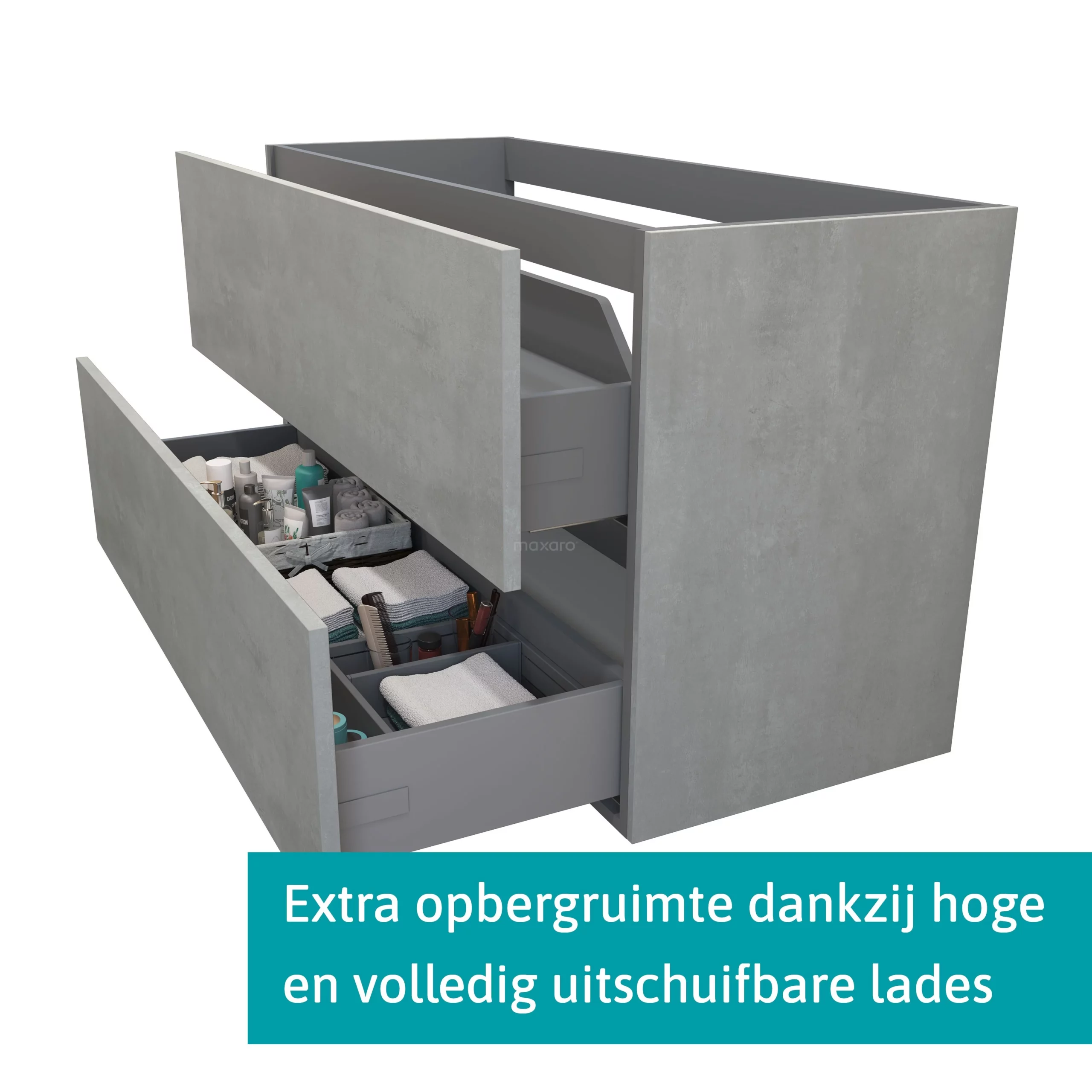 Dankzij het stijlvolle design is dit badkamermeubel de eyecatcher van uw badkamer. De onderkast is voorzien van een vlak front en heeft een afwerking in lichtgrijs beton. Deze stoere betonlook geeft uw badkamerinterieur een industriële look-and-feel. Daarnaast zorgt het vlakke front voor een tijdloze touch. De handgrepen dient u zelf toe te voegen. Deze zijn verkrijgbaar in verschillende kleuren en vormen.