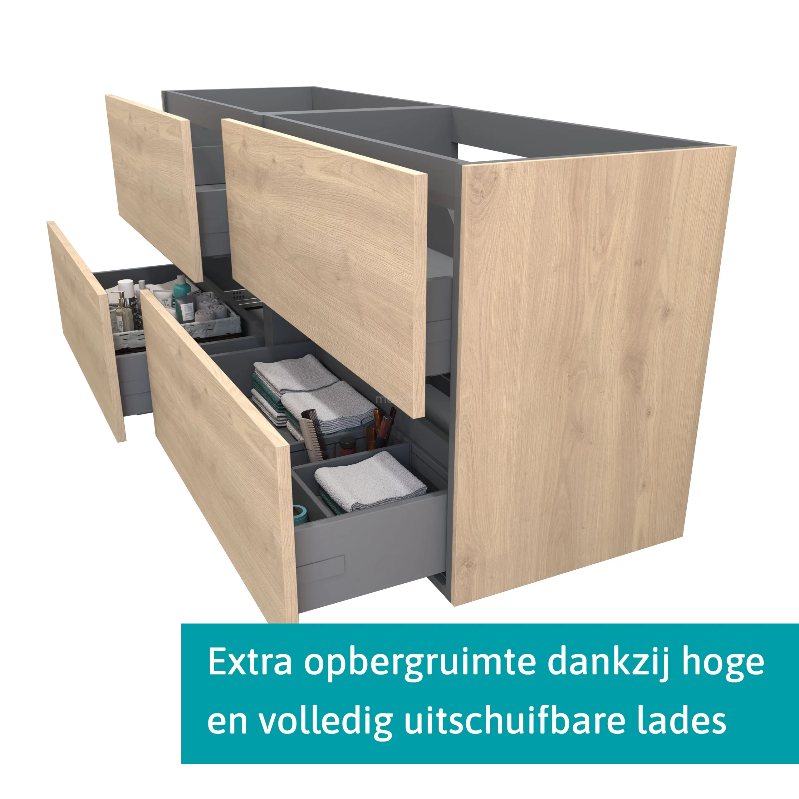 De onderkast is uitgerust met 4 lades, waarin u plaats heeft voor al uw badkamerspullen. Door het systeem met softopen en -close openen en sluiten de lades geluidloos. Bovendien zijn ze extra hoog en volledig uitschuifbaar. Verder heeft het meubel een slimme sifonuitsparing. Hierdoor benut u de beschikbare ruimte optimaal.