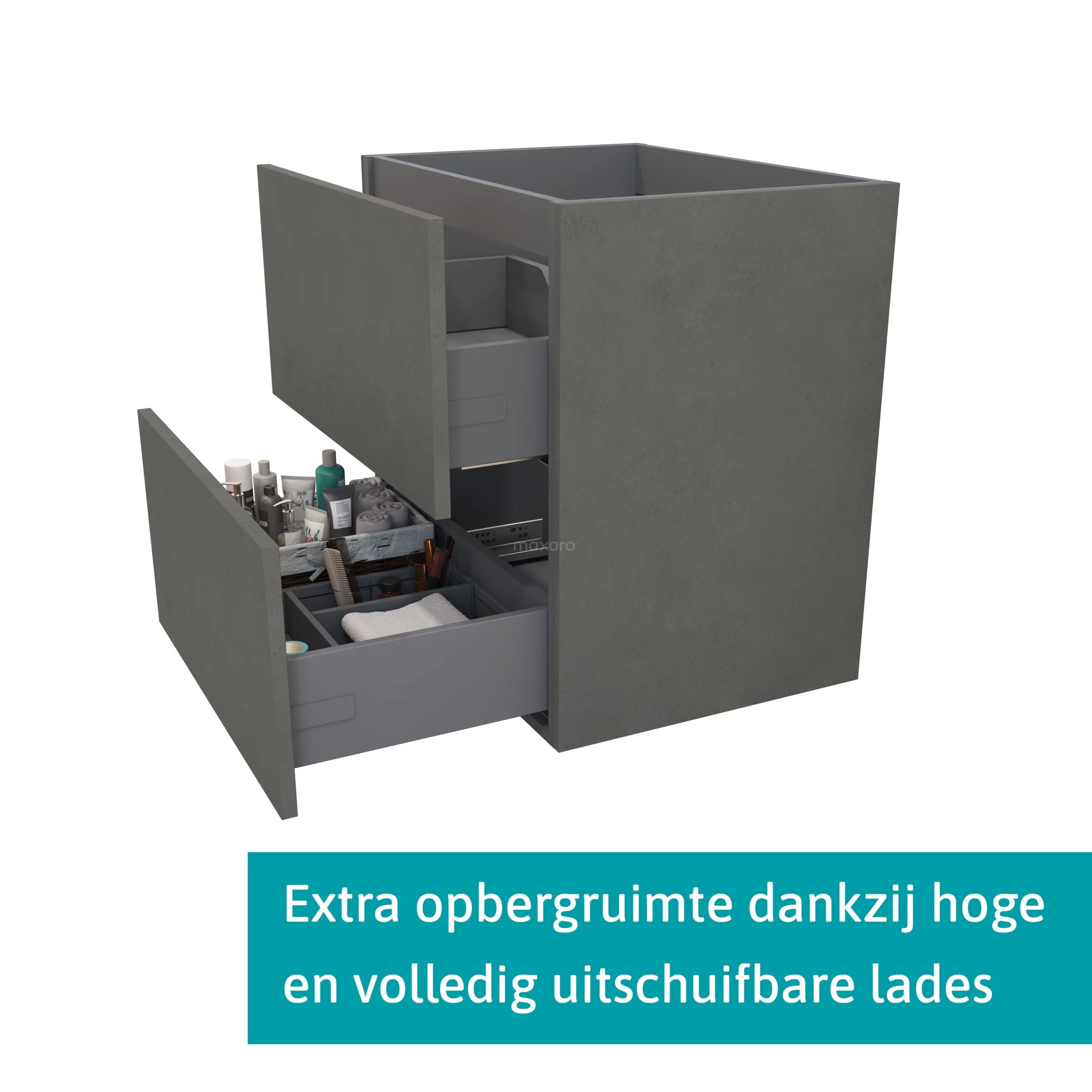 Dankzij het stijlvolle design is dit badkamermeubel de eyecatcher van uw badkamer. De onderkast is voorzien van een vlak front en heeft een afwerking in donkergrijs beton. Deze stoere betonlook geeft uw badkamerinterieur een industriële look-and-feel. Daarnaast zorgt het vlakke front voor een tijdloze touch. De handgrepen dient u zelf toe te voegen. Deze zijn verkrijgbaar in verschillende kleuren en vormen