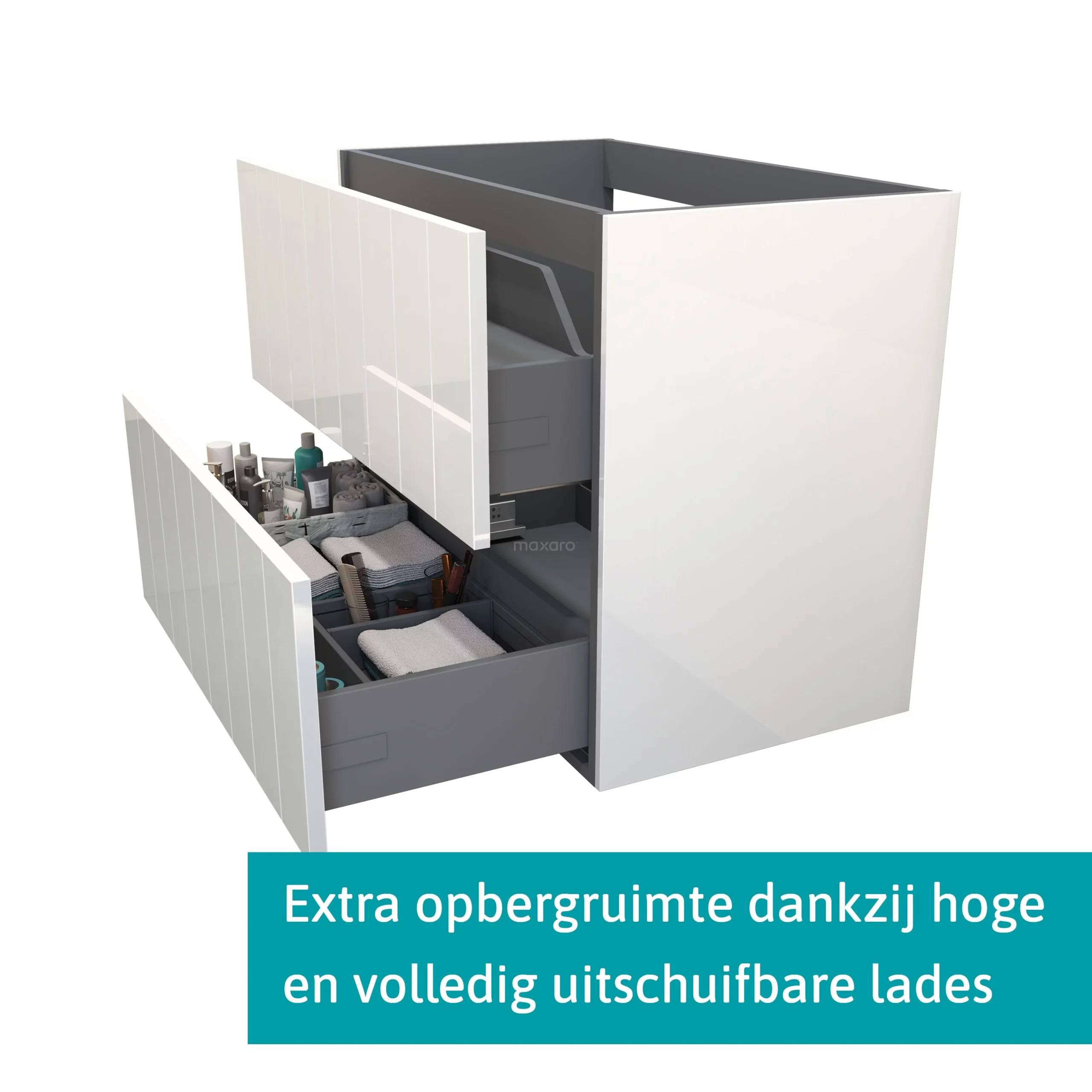 Dankzij het stijlvolle design is dit badkamermeubel de eyecatcher van uw badkamer. De onderkast is voorzien van een lamelfront en heeft een hoogglans witte afwerking. Deze kleur heeft een moderne uitstraling en geeft het meubel een frisse look-and-feel. Daarnaast zorgt het lamelfront voor een landelijke touch. De handgrepen dient u zelf toe te voegen. Deze zijn verkrijgbaar in verschillende kleuren en vormen.
