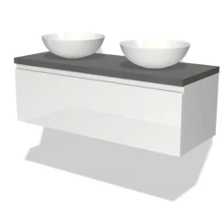 Dankzij het prachtige design is dit badkamermeubel de eyecatcher van uw badkamer. De hoogglans witte onderkast heeft een moderne uitstraling en is voorzien van een wastafelblad in donkergrijs beton. Daarnaast beschikt het meubel over een greeploos front voor een strakke touch.