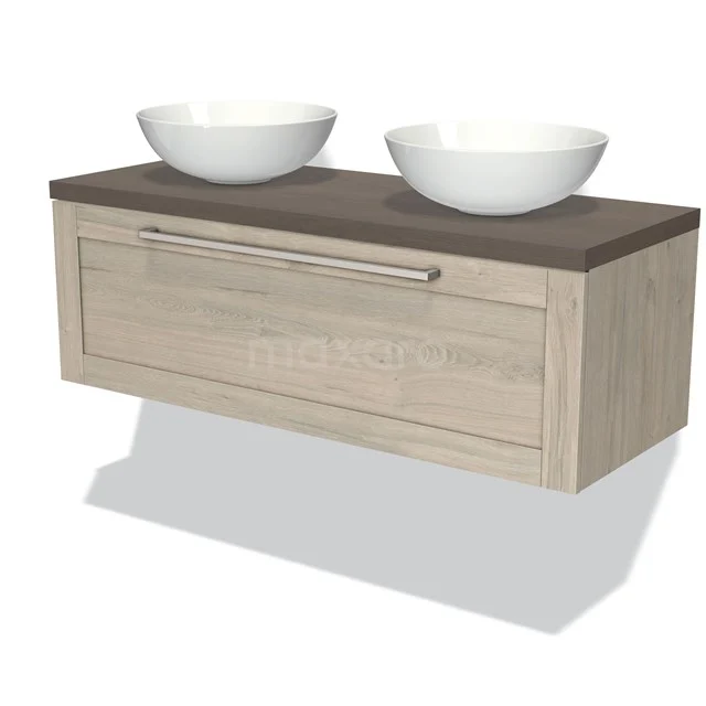 Dankzij het prachtige design is dit badkamermeubel de eyecatcher van uw badkamer. De lichtgrijs eiken onderkast heeft een sfeervolle uitstraling en is voorzien van een wastafelblad in donkerbruin eiken. Daarnaast beschikt het meubel over een kaderfront voor een klassieke touch. De handgreep dient u zelf toe te voegen. Deze is verkrijgbaar in verschillende kleuren en vormen.