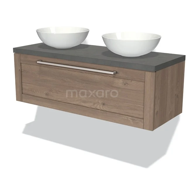 Dankzij het prachtige design is dit badkamermeubel de eyecatcher van uw badkamer. De middenbruin eiken onderkast heeft een warme uitstraling en is voorzien van een wastafelblad in donkergrijs beton. Daarnaast beschikt het meubel over een kaderfront voor een klassieke touch. De handgreep dient u zelf toe te voegen. Deze is verkrijgbaar in verschillende kleuren en vormen.