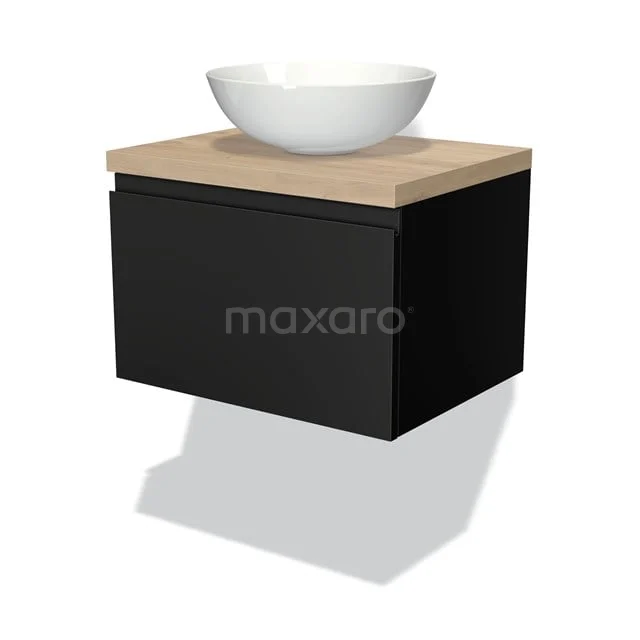 Dankzij het prachtige design is dit badkamermeubel de eyecatcher van uw badkamer. De mat zwarte onderkast heeft een industriële look-and-feel en is voorzien van een wastafelblad in lichtbruin eiken. Daarnaast beschikt het meubel over een greeploos front voor een strakke touch.