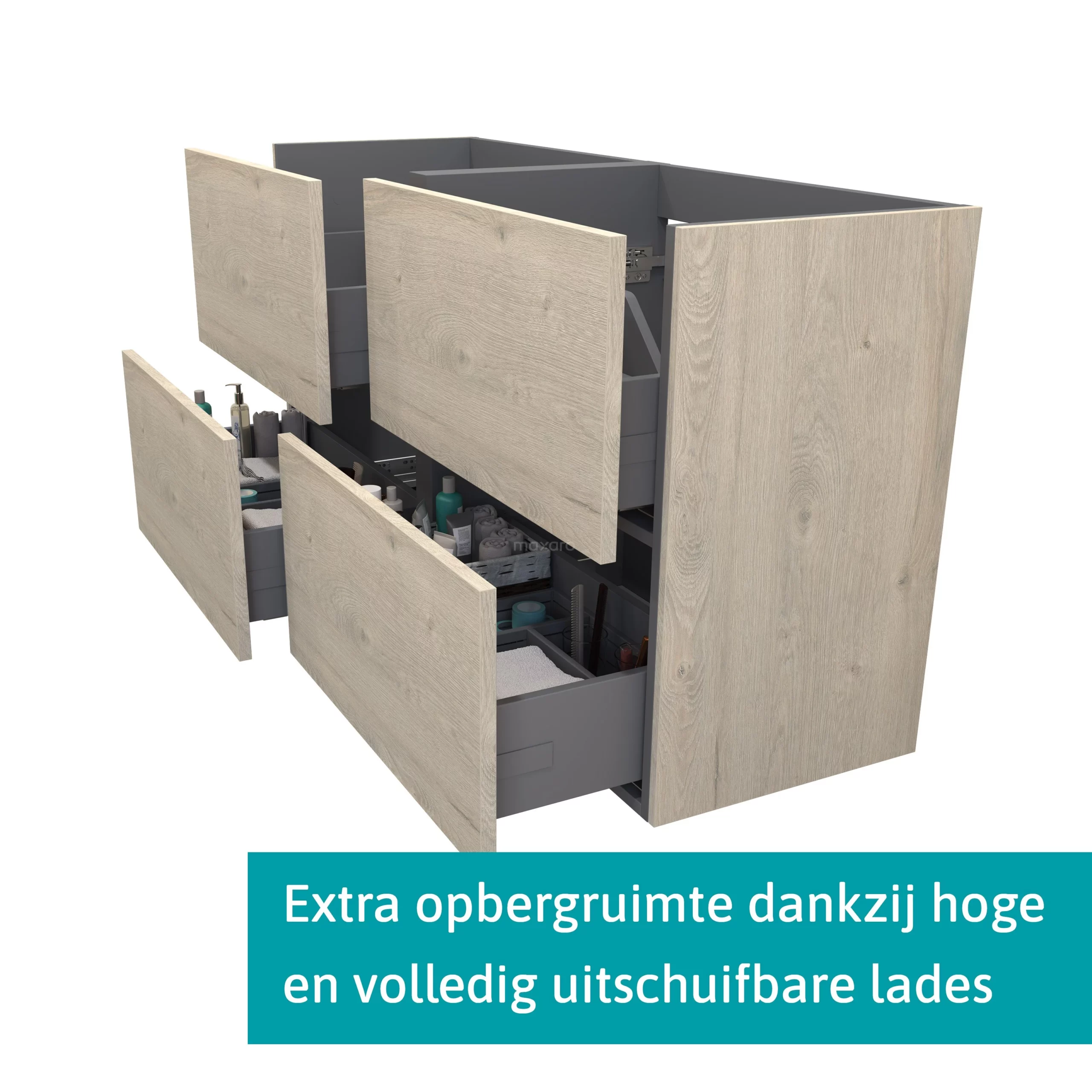 De onderkast is uitgerust met 4 lades, waarin u plaats heeft voor al uw badkamerspullen. Door het systeem met softopen en -close openen en sluiten de lades geluidloos. Bovendien zijn ze extra hoog en volledig uitschuifbaar. Verder heeft het meubel een slimme sifonuitsparing. Hierdoor benut u de beschikbare ruimte optimaal.
