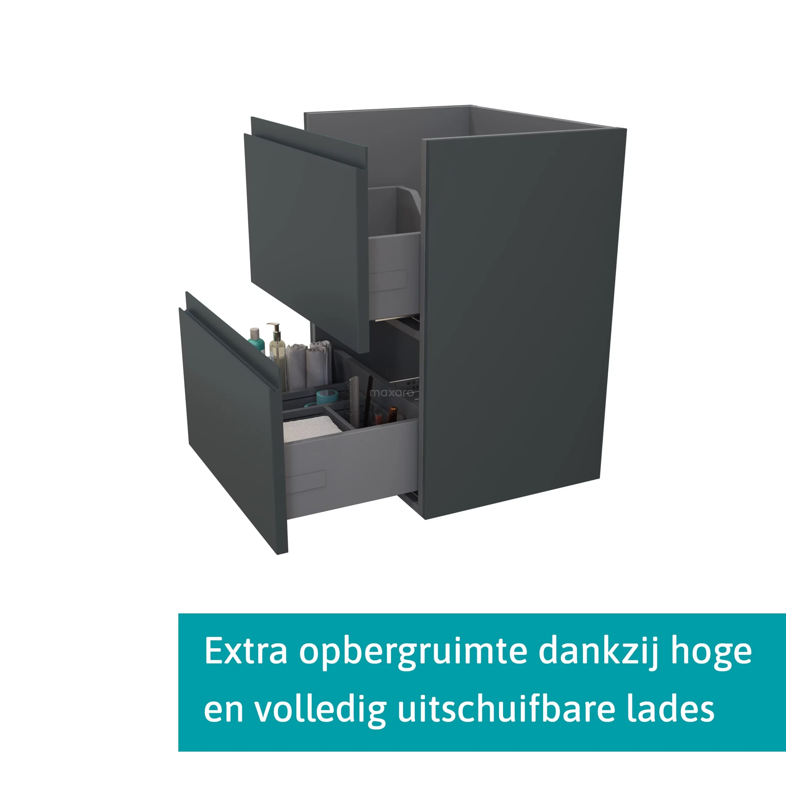 Dankzij het stijlvolle design is dit wastafelmeubel de eyecatcher van uw badkamer. De onderkast beschikt over een greeploos front en heeft een donkergrijze afwerking. Deze kleur heeft een moderne uitstraling en geeft uw badkamerinterieur een strakke look-and-feel. Daarnaast zorgt het greeploze front voor een strakke touch.