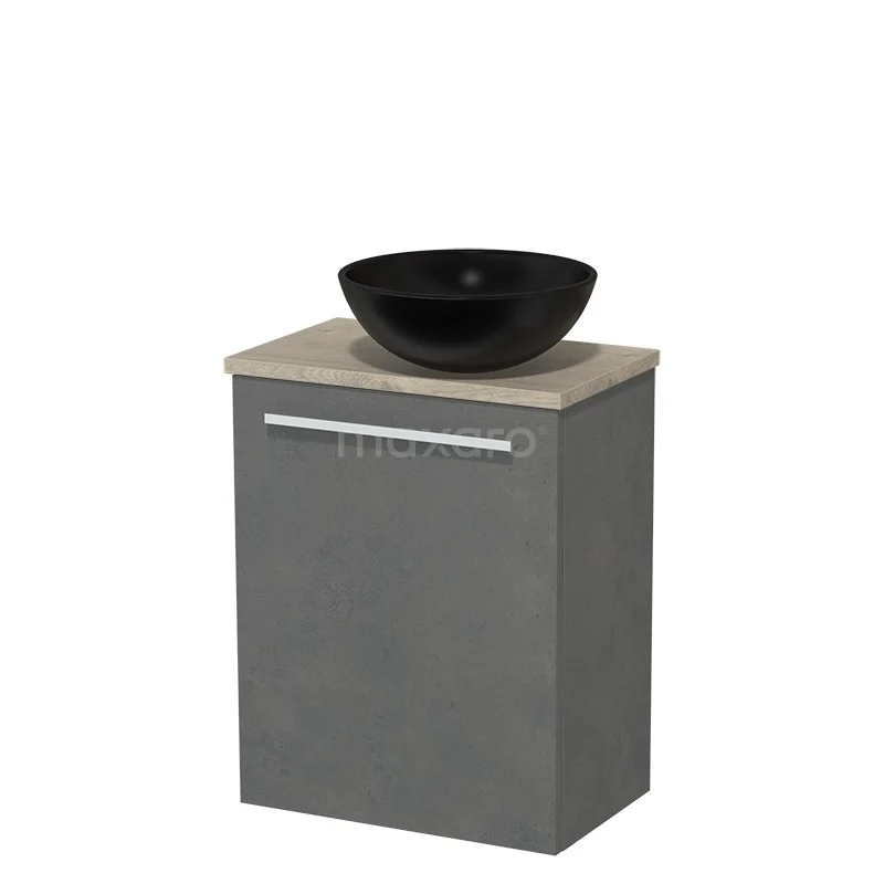 Dankzij het prachtige design is het meubel een blikvanger in de toiletruimte. De onderkast heeft een donkergrijze betonnen afwerking met een lichtgrijs eiken wastafelblad.