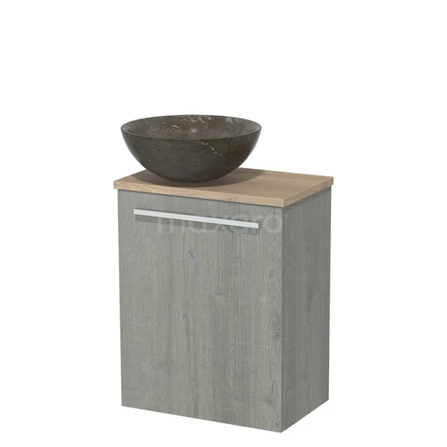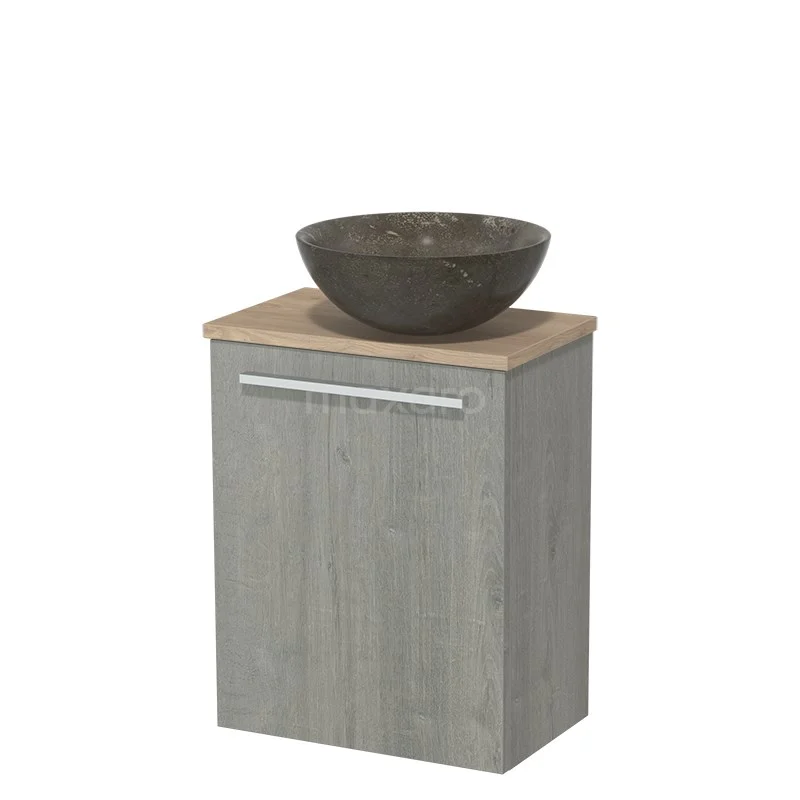 Dankzij het prachtige design is het meubel een blikvanger in de toiletruimte. De onderkast heeft een grijs eiken afwerking met een lichtbruin eiken wastafelblad.