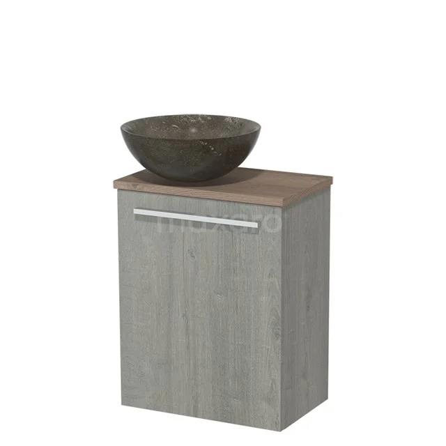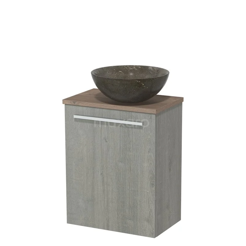 Dankzij het prachtige design is het meubel een blikvanger in de toiletruimte. De onderkast heeft een grijs eiken afwerking met een middenbruin eiken wastafelblad.