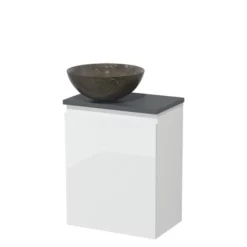 Dankzij het prachtige design is het meubel een blikvanger in de toiletruimte. De onderkast heeft een hoogglans witte afwerking met een donkergrijs wastafelblad.