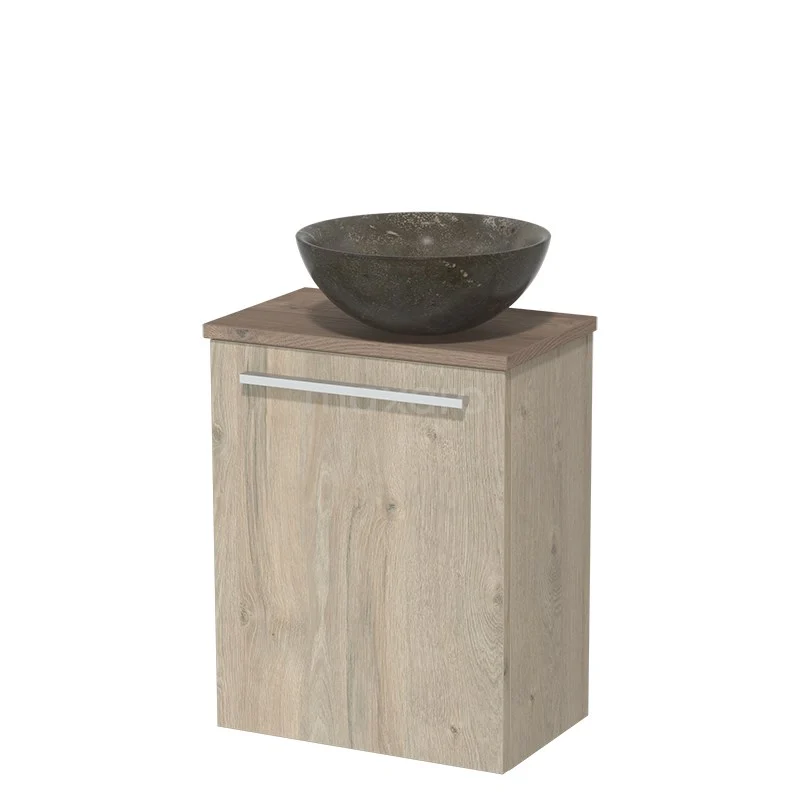 Dankzij het prachtige design is het meubel een blikvanger in de toiletruimte. De onderkast heeft een lichtgrijs eiken afwerking met een middenbruin eiken wastafelblad.