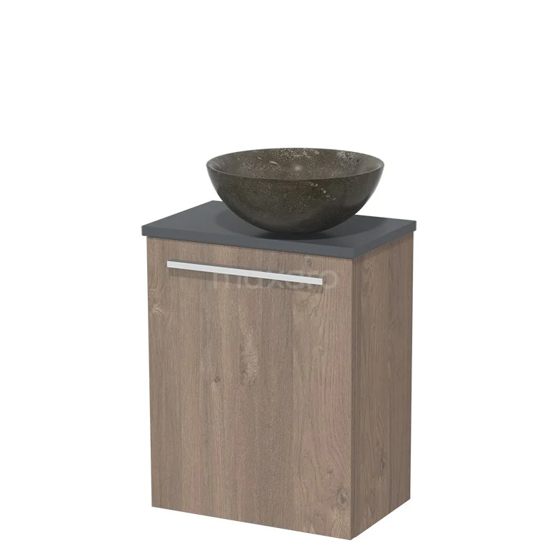 Dankzij het prachtige design is het meubel een blikvanger in de toiletruimte. De onderkast heeft een middenbruin eiken afwerking met een donkergrijs wastafelblad.