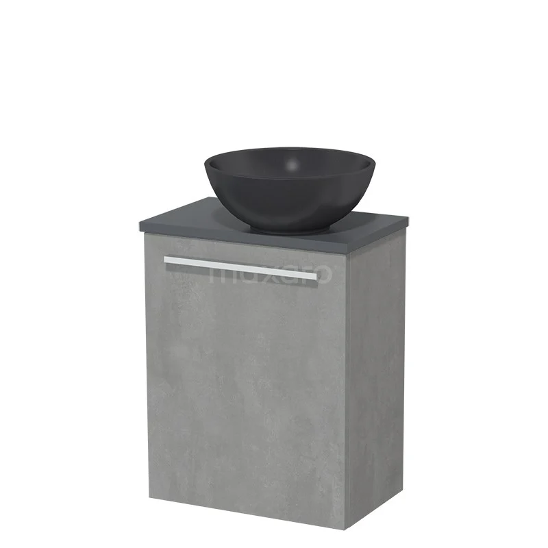 Dankzij het prachtige design is het meubel een blikvanger in de toiletruimte. De onderkast heeft een lichtgrijs betonnen afwerking met een donkergrijs wastafelblad.