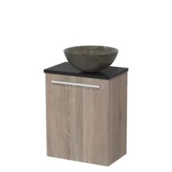 Dankzij het prachtige design is het meubel een blikvanger in de toiletruimte. De onderkast heeft een mat zwarte afwerking met een lichtbruin eiken wastafelblad.