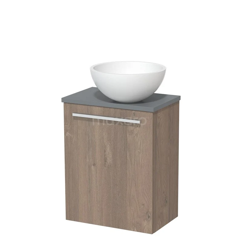 Dankzij het prachtige design is het meubel een blikvanger in de toiletruimte. De onderkast heeft een middenbruin eiken afwerking met een middengrijs wastafelblad.